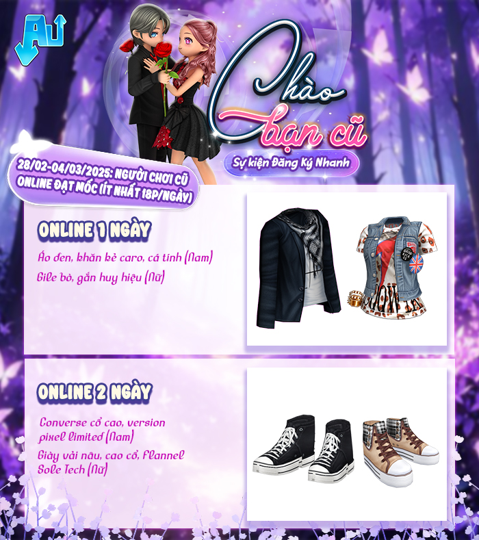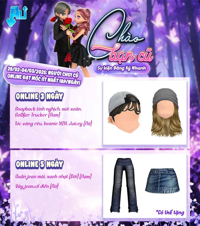 Hoạt động: Tài khoản không login game từ 1/12/2024 - 31/1/2025, nhưng có online trước đó, trong thời gian sự kiện có đăng nhập game Audition và hoàn thành các nhiệm vụ sau: