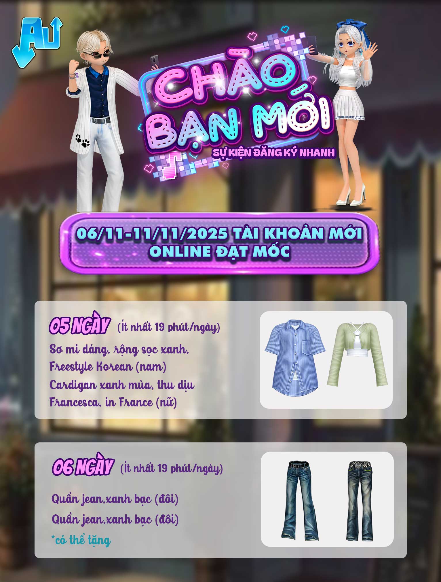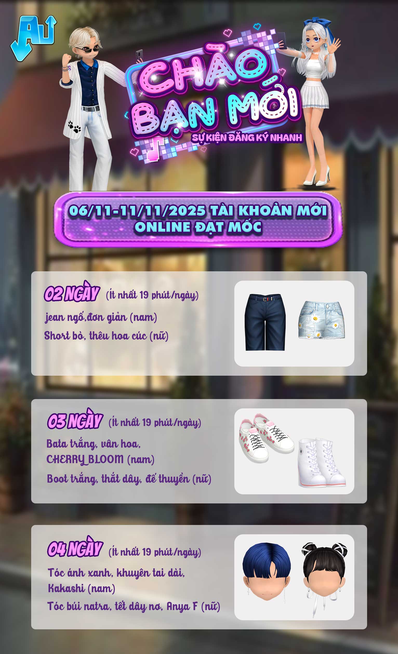 Đối tượng tham gia: Tài khoản tạo mới từ ngày 06/11/2025 đến ngày 11/11/2025, trong thời gian sự kiện có đăng nhập game Audition và hoàn thành các nhiệm vụ sau: