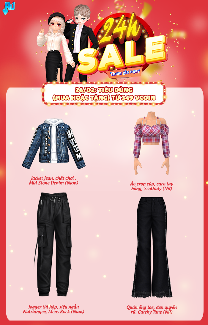 Nội dung: Tất cả tài khoản tham gia giao dịch Vcoin (mua hoặc tặng) trong game (bao gồm Siêu thị thời trang + Couple Shop + Baby Shop + Vườn + Thông báo Chung bằng Vcoin) trong thời gian sự kiện theo các mốc Vcoin sau: