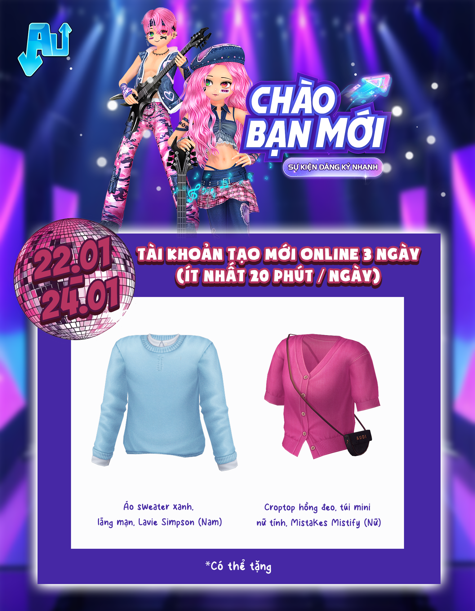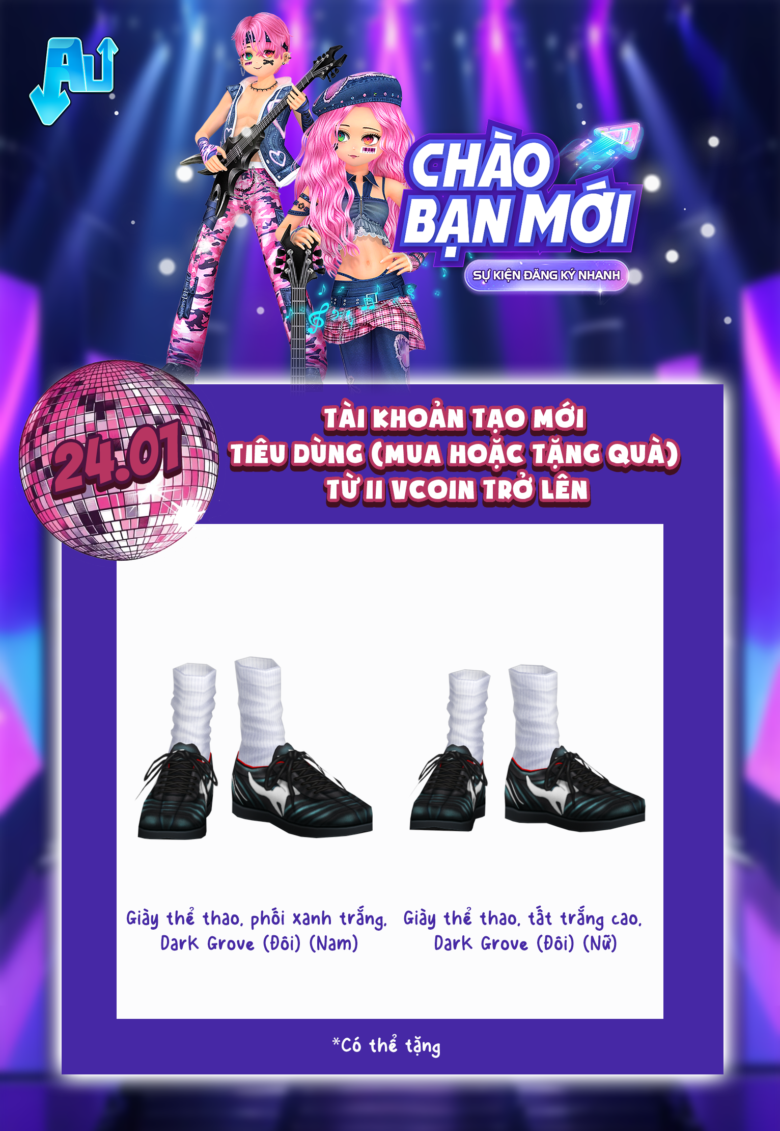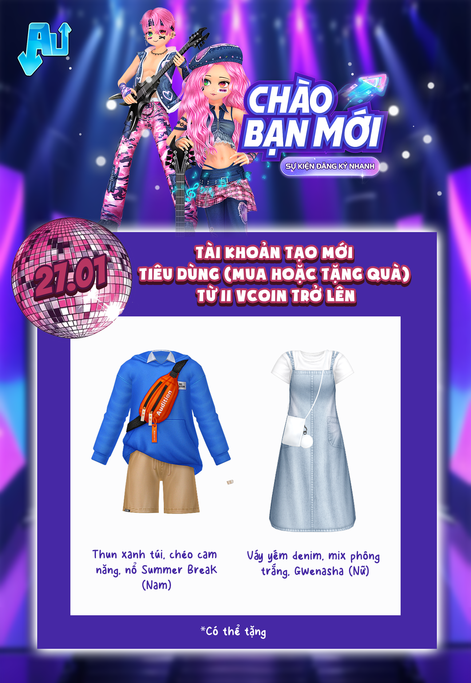 Chào mừng bạn đã chính thức gia nhập thế giới Audition – nơi âm nhạc, vũ đạo và cá tính gặp nhau! Ngay từ những bước đầu tiên, Audition đã chuẩn bị sẵn loạt phần quà hấp dẫn dành riêng cho các vũ công mới trong sự kiện
