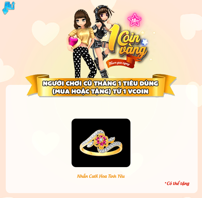 Nội dung: Các tài khoản tạo trong tháng 01/2023, khi tham gia giao dịch Vcoin (mua hoặc tặng) trong game (bao gồm Siêu thị thời trang + Couple Shop + Baby Shop + Vườn + Thông báo Chung bằng Vcoin) trong thời gian sự kiện theo các mốc Vcoin sau: