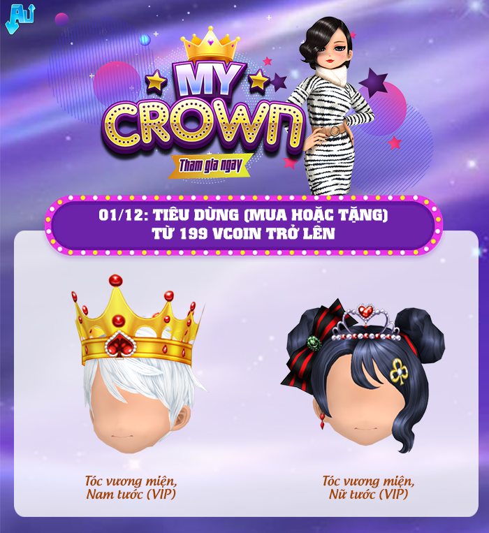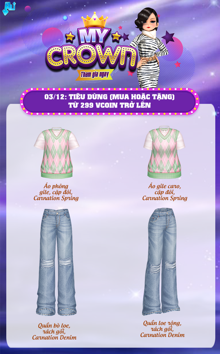 Nội dung: Tất cả tài khoản tham gia giao dịch Vcoin (mua hoặc tặng) trong game (bao gồm Siêu thị thời trang + Couple Shop + Baby Shop + Vườn + Thông báo Chung bằng Vcoin) trong thời gian sự kiện theo các mốc Vcoin sau: