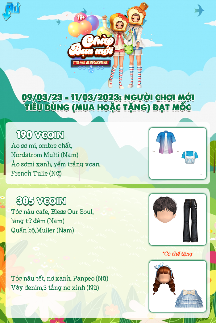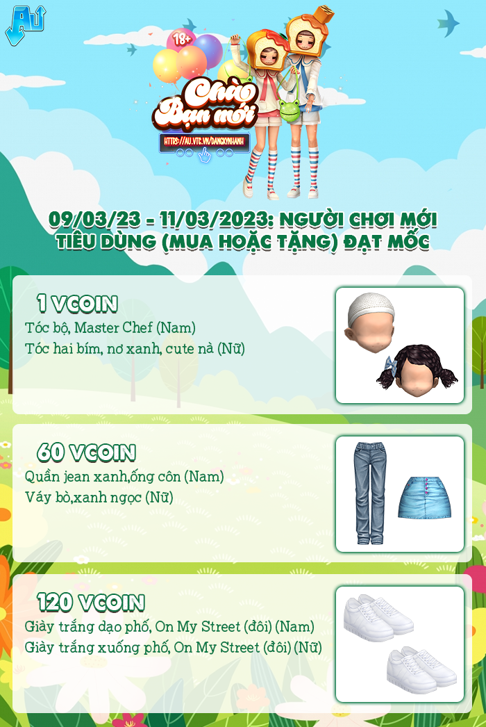Hoạt động: Tài khoản tạo mới từ ngày 09/03/2023 đến ngày 11/03/2023, tham gia giao dịch Vcoin (mua hoặc tặng) trong game (bao gồm Siêu thị thời trang + Couple Shop + Baby Shop + Vườn + Thông báo Chung bằng Vcoin) trong thời gian sự kiện theo các mốc Vcoin sau: