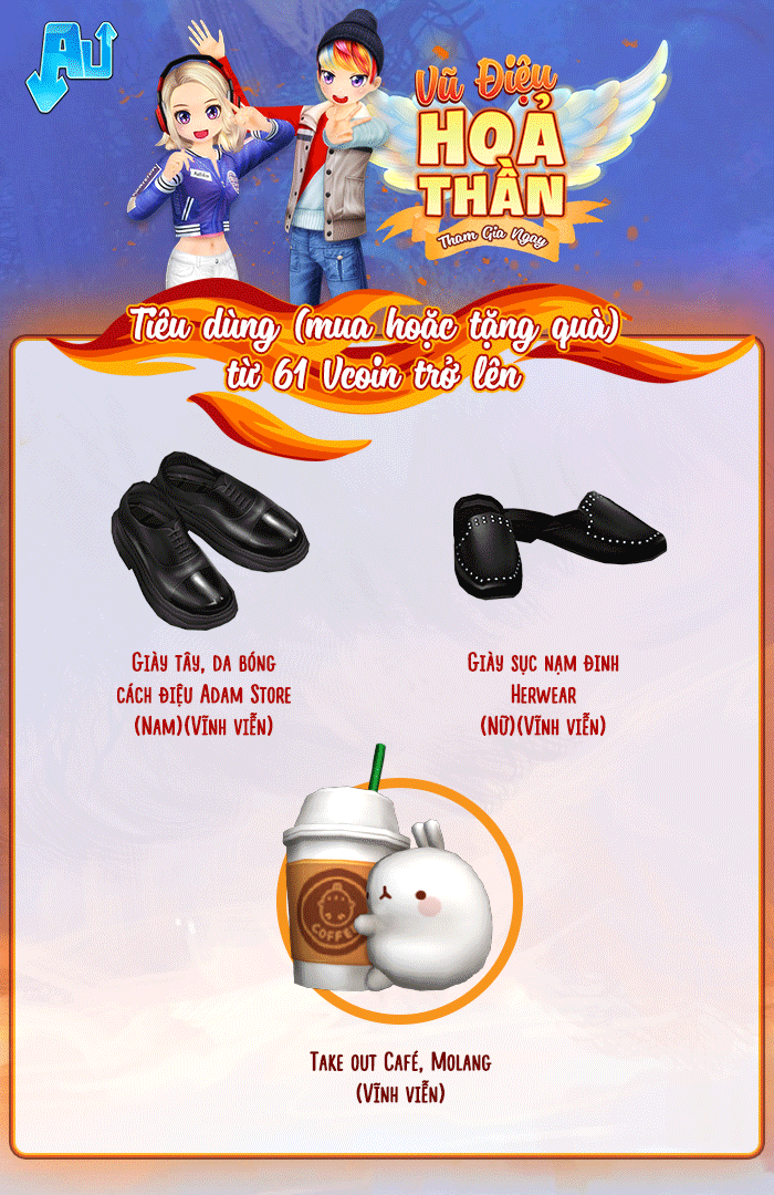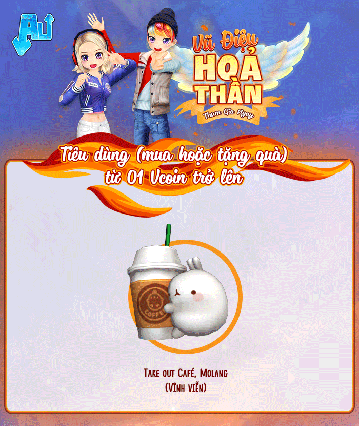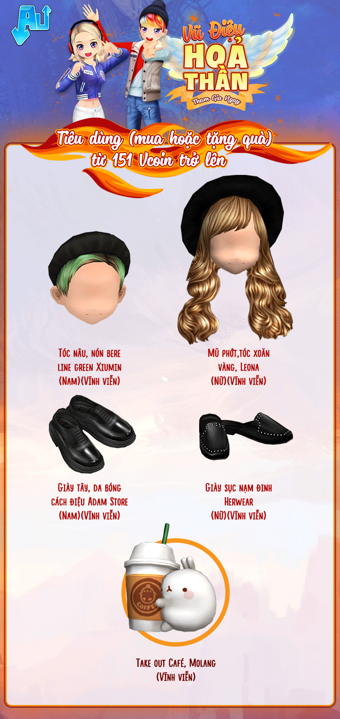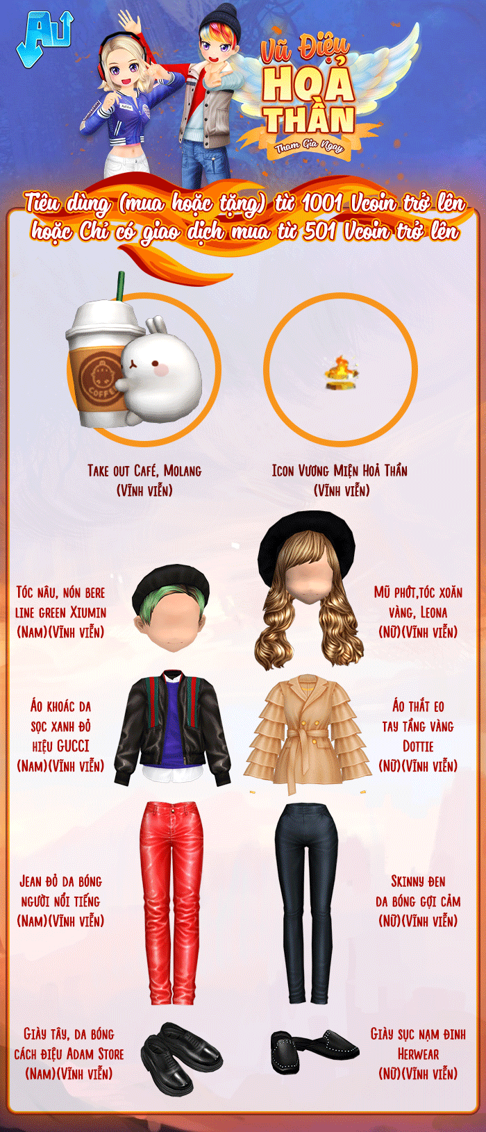 Nội dung: Tất cả tài khoản tham gia giao dịch Vcoin (mua hoặc tặng) trong game (bao gồm Siêu thị thời trang + Couple Shop + Baby Shop + Vườn + Thông báo Chung bằng Vcoin) trong thời gian sự kiện theo các mốc Vcoin sau: