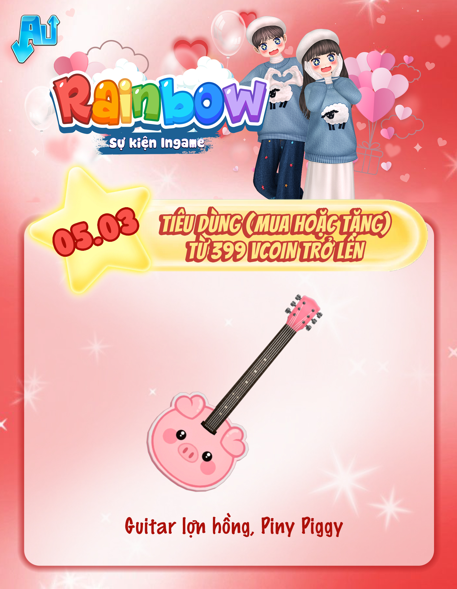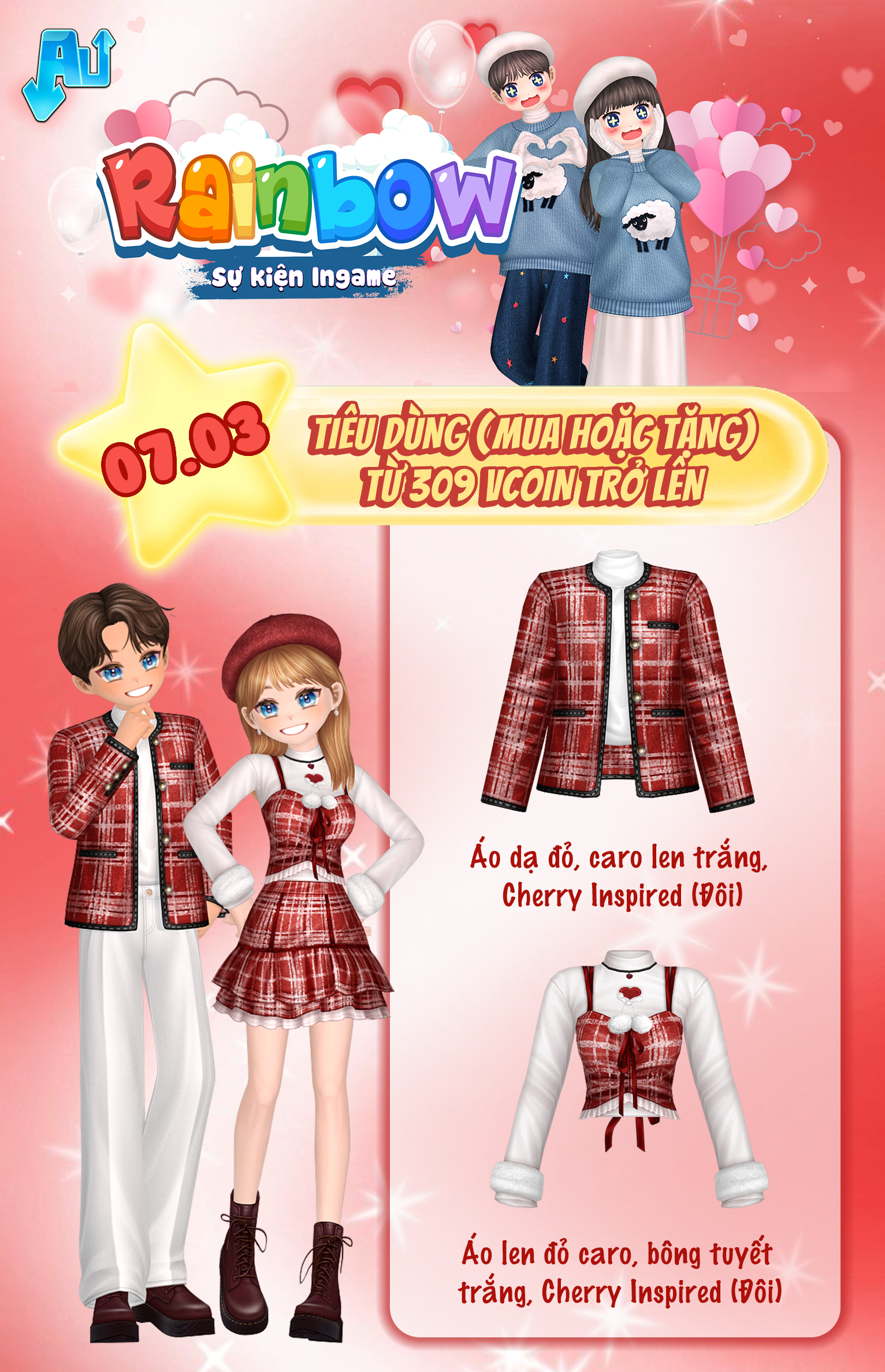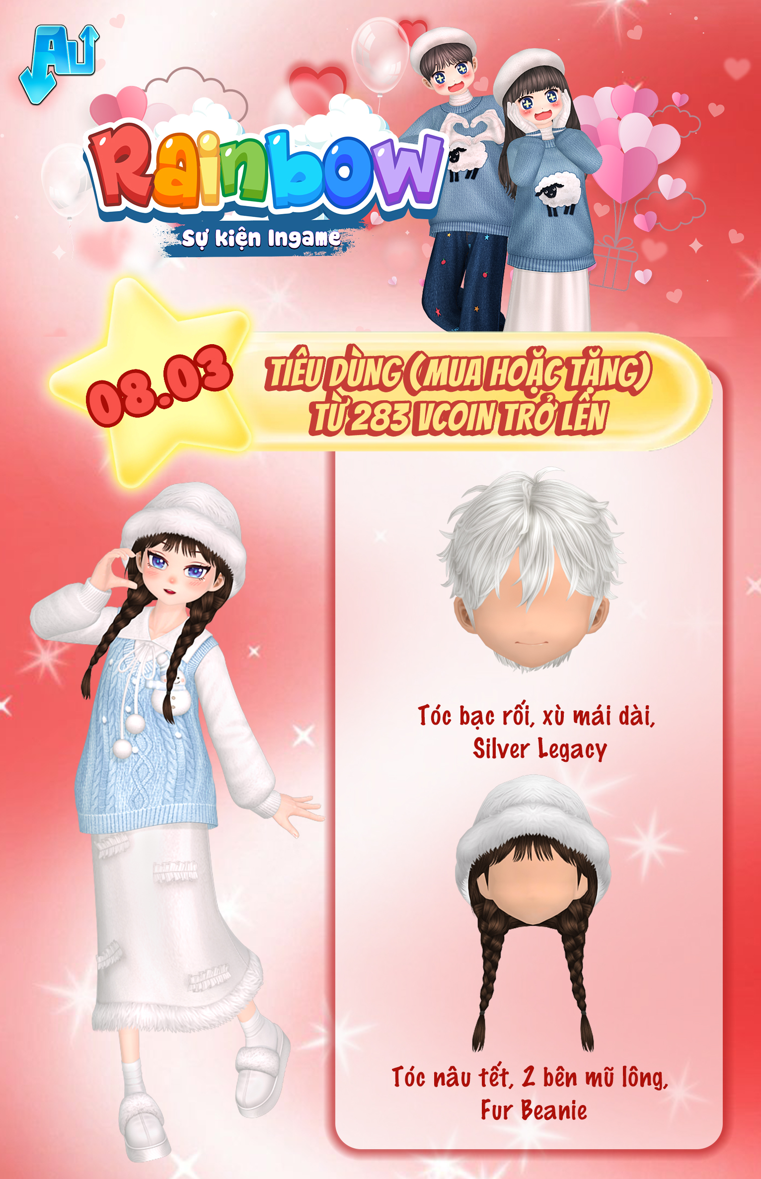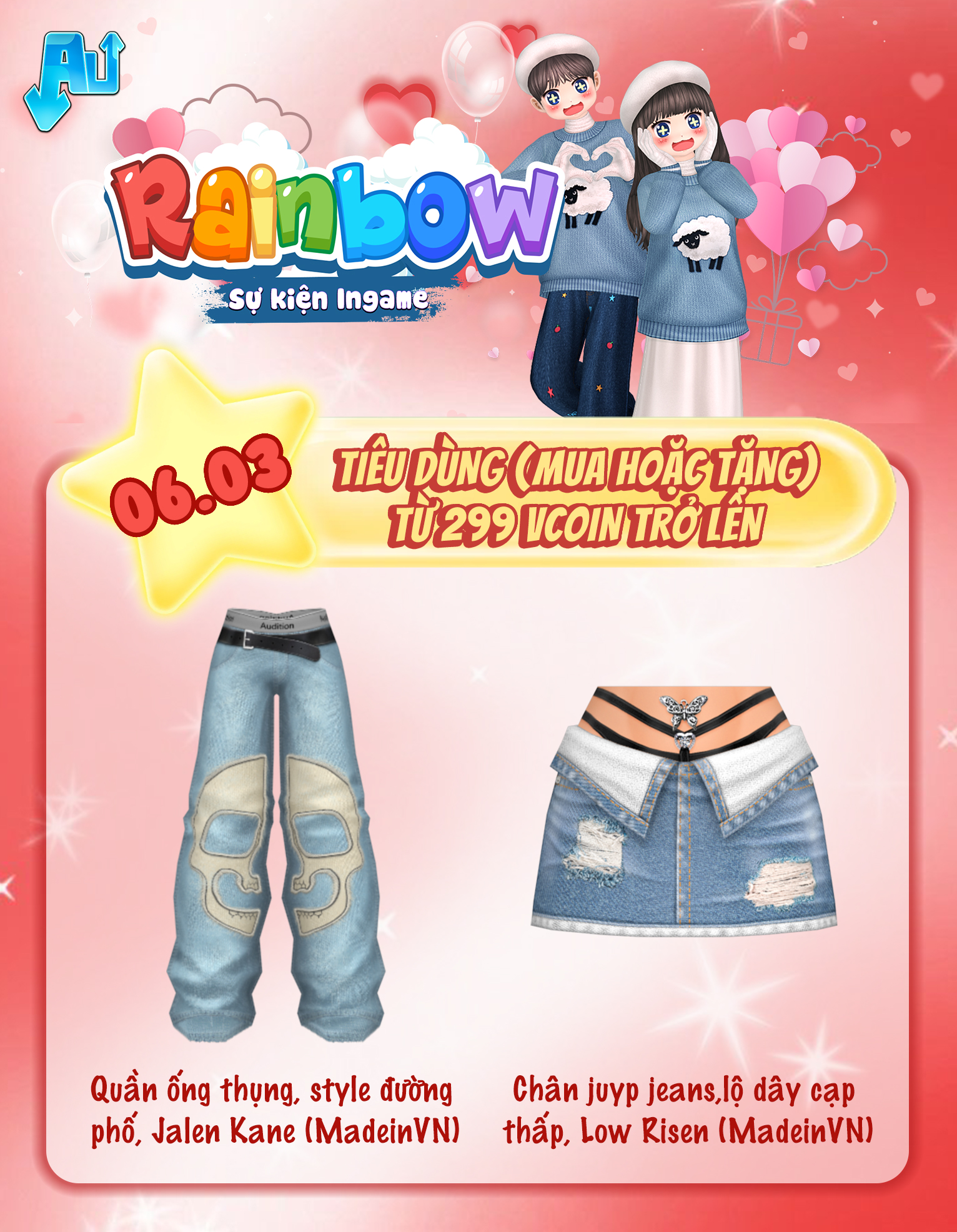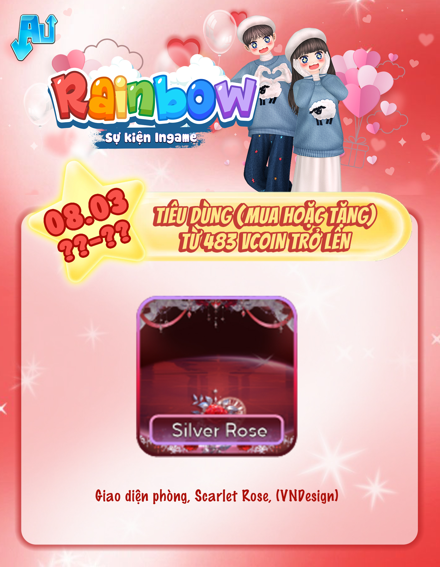 Nội dung: Tất cả tài khoản tham gia giao dịch Vcoin (mua hoặc tặng) trong game (bao gồm Siêu thị thời trang + Couple Shop + Baby Shop + Vườn + Thông báo Chung bằng Vcoin) trong thời gian sự kiện theo các mốc Vcoin sau: