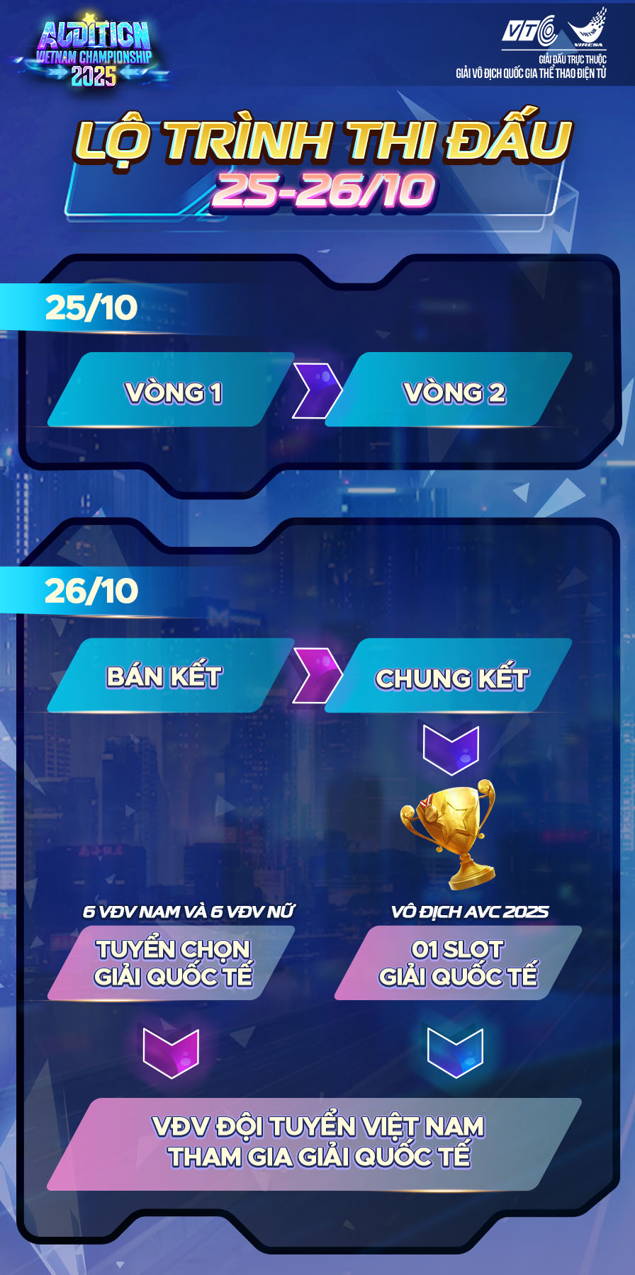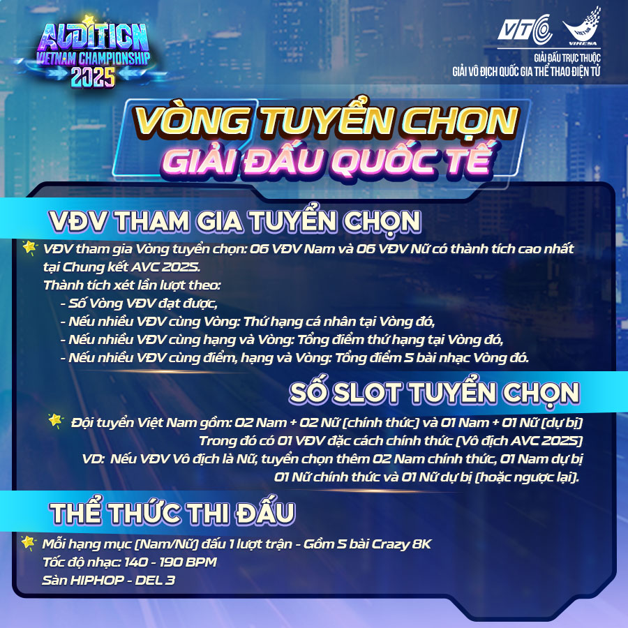 Chỉ còn vài ngày nữa là Vòng Chung kết Giải đấu Audition Vietnam Championship 2025 (AVC 2025) sẽ chính thức bắt đầu, đưa cộng đồng Thành Phố Vũ Hội đến với những màn trình diễn nhảy đỉnh cao! Năm nay, AVC 2025 chính thức được công nhận là giải đấu trực thuộc Giải Vô địch Quốc gia Thể thao điện tử - bộ môn Audition. Đồng thời, tiếp nối Vòng chung kết AVC chính là Vòng tuyển chọn đội tuyển Việt Nam - cũng là cơ hội để các tài năng xuất chúng ghi danh vào đội tuyển Việt Nam và thi đấu giải Audition quốc tế vào cuối năm 2025.