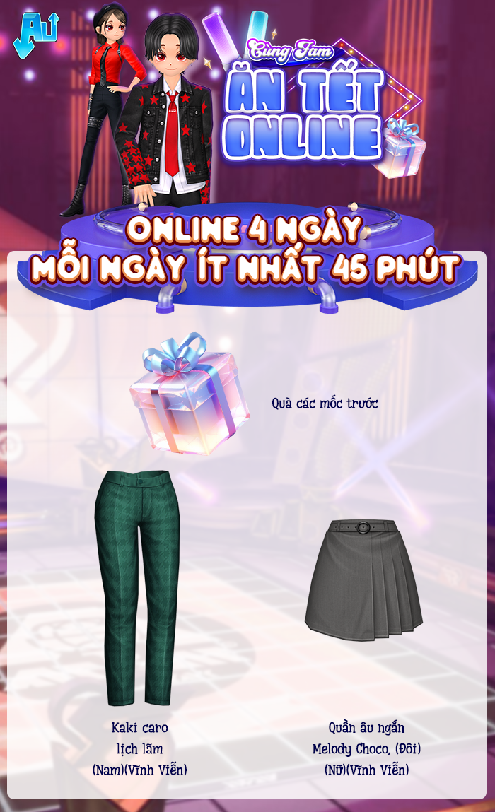 Online 2 ngày, mỗi ngày tối thiểu 45 phút - nhận gói item trị giá 100 vcoin.