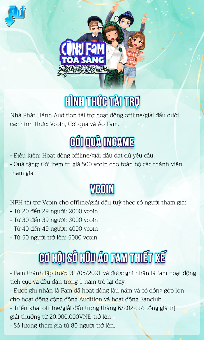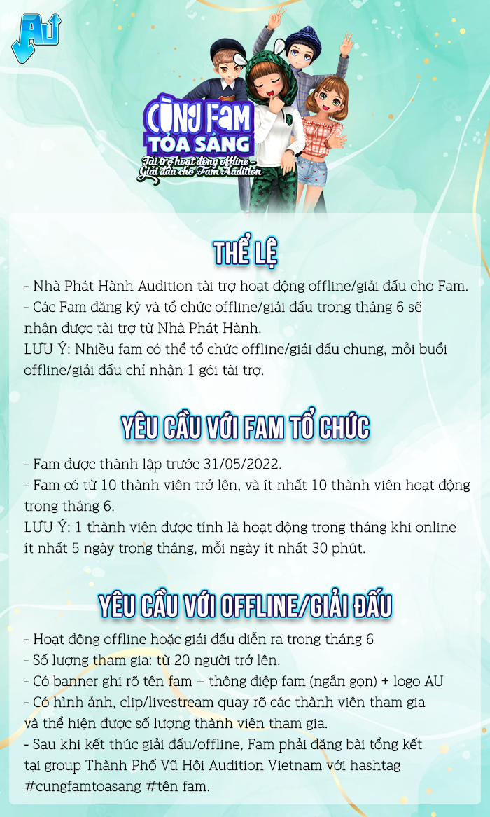Nhận thấy các Fam đang hoạt động ngày càng sôi nổi và gắn kết, BQT Audition cũng luôn muốn cổ vũ và khích lệ các "gia đình nhỏ" của Thành Phố Vũ Hội. Đã bao lâu rồi các bạn không offline, không gặp gỡ và vui chơi để thân thiết với nhau hơn ngoài đời thực? Vậy thì trong tháng 6 này, Audition sẽ tài trợ rất nhiều quà tặng: Vcoin, Item, Áo Fam... cho các Fam gặp mặt nhau đó!