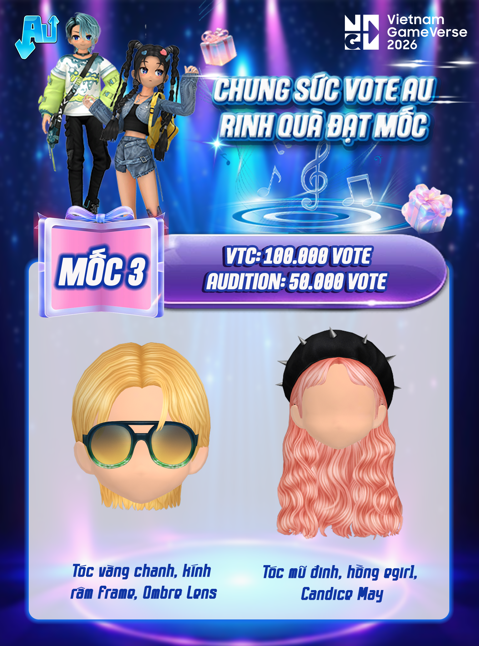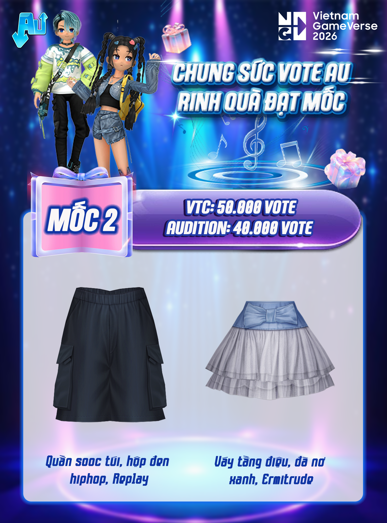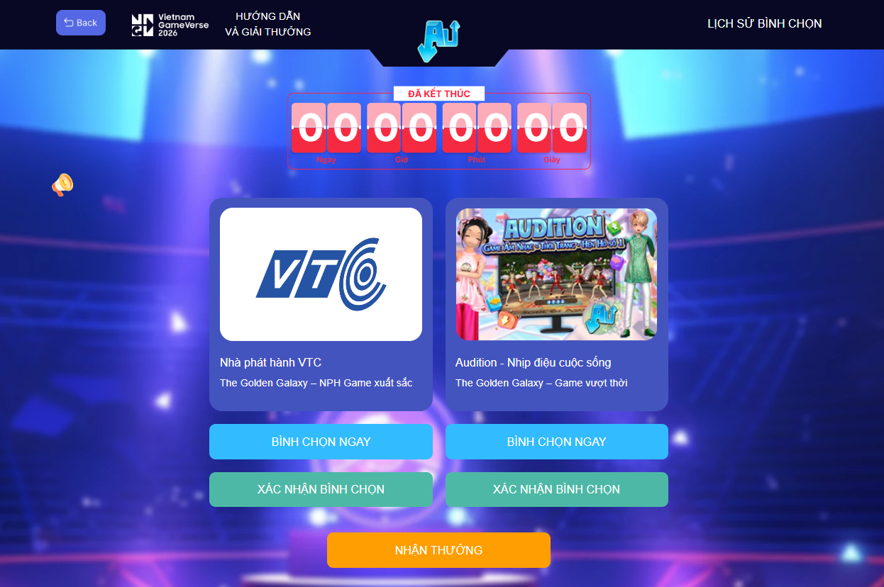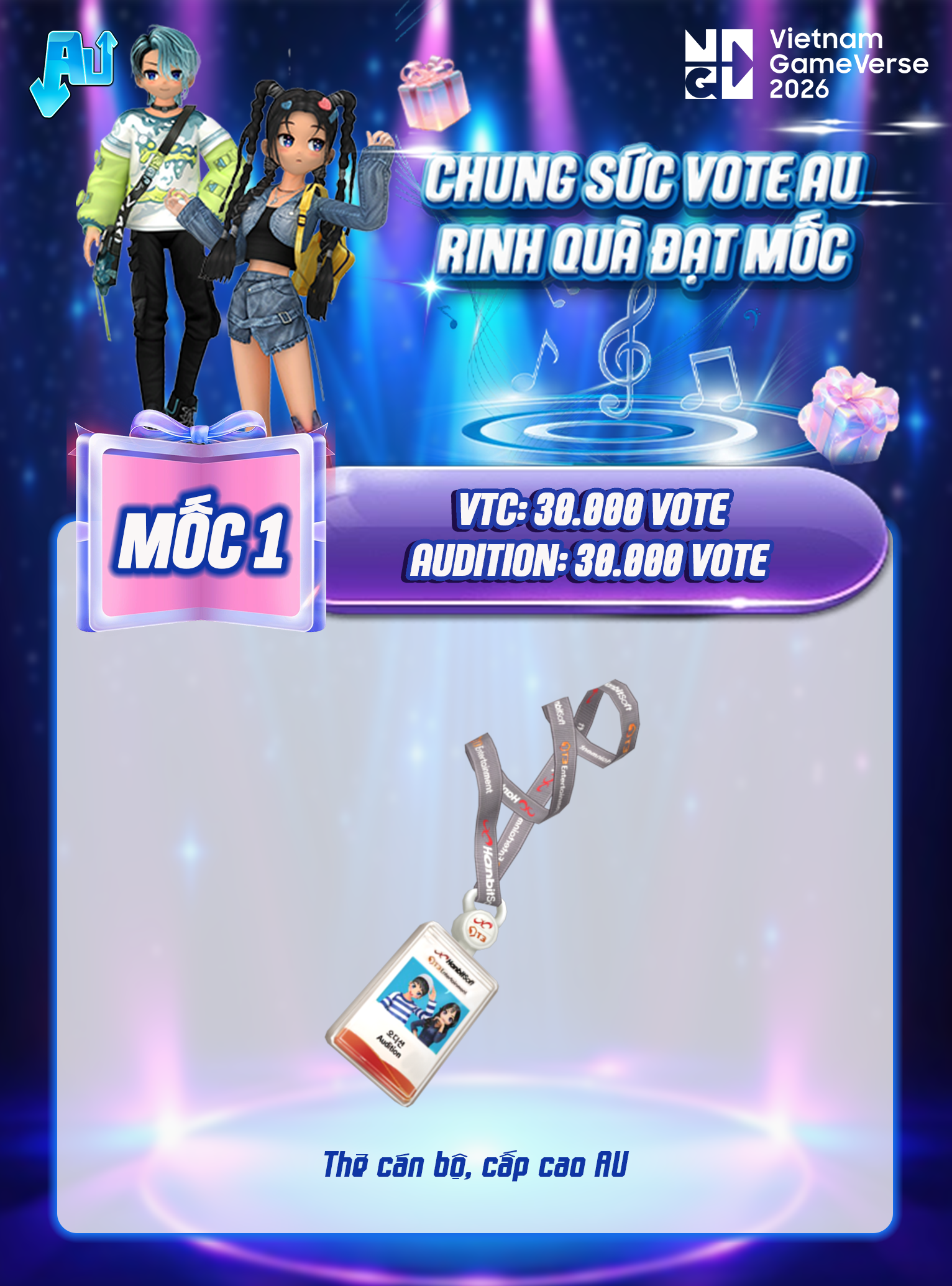 Mùa GameVerse 2026 chính thức bùng nổ, cộng đồng chúng ta hãy cùng tiếp sức cho Audition trong hành trình chinh phục danh hiệu “Game Vượt Thời Gian” và đồng hành cùng NPH VTC hướng tới mục tiêu “Nhà phát hành game xuất sắc nhất”! ✨