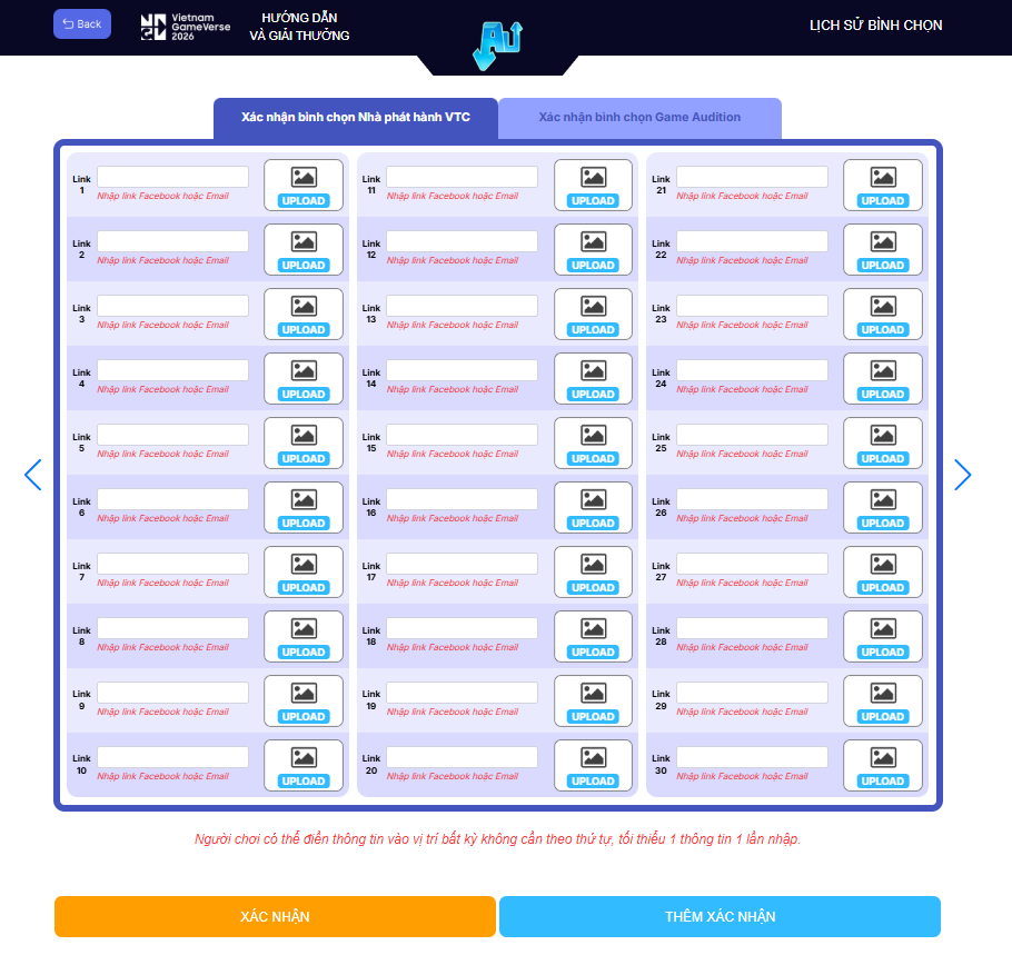 - Sau khi đã điền hết 1 bảng = 30 link, người chơi có thể THÊM XÁC NHẬN để tạo thêm bảng mới và nhập thêm link.