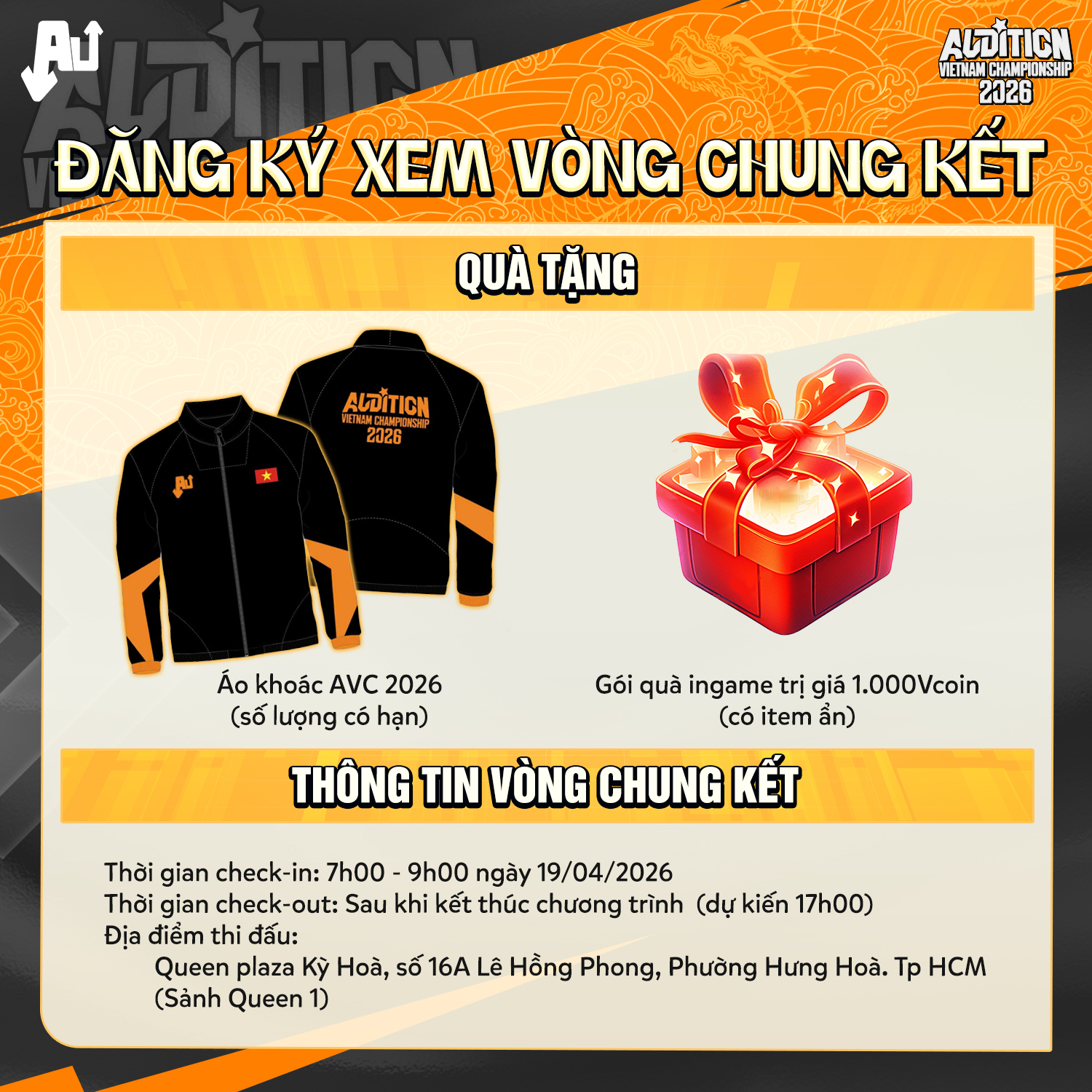 Đây chính là bữa tiệc eSports đỉnh cao, lần đầu có chung kết 1 giải đấu quốc gia của Audition tổ chức tại Tp.HCM! Hãy đến trực tiếp tại khán đài, cùng hòa mình vào không khí sôi động và cuồng nhiệt, chứng kiến tận mắt những khoảnh khắc bùng nổ và rinh về những món quà độc quyền siêu chất chỉ dành riêng cho khán giả offline nhé!