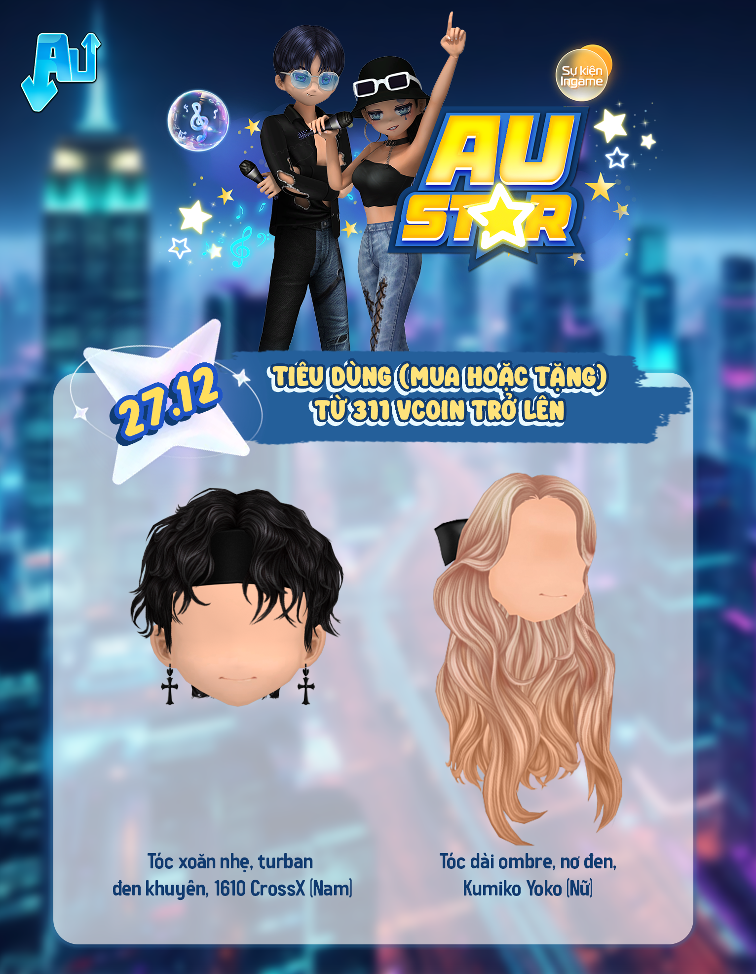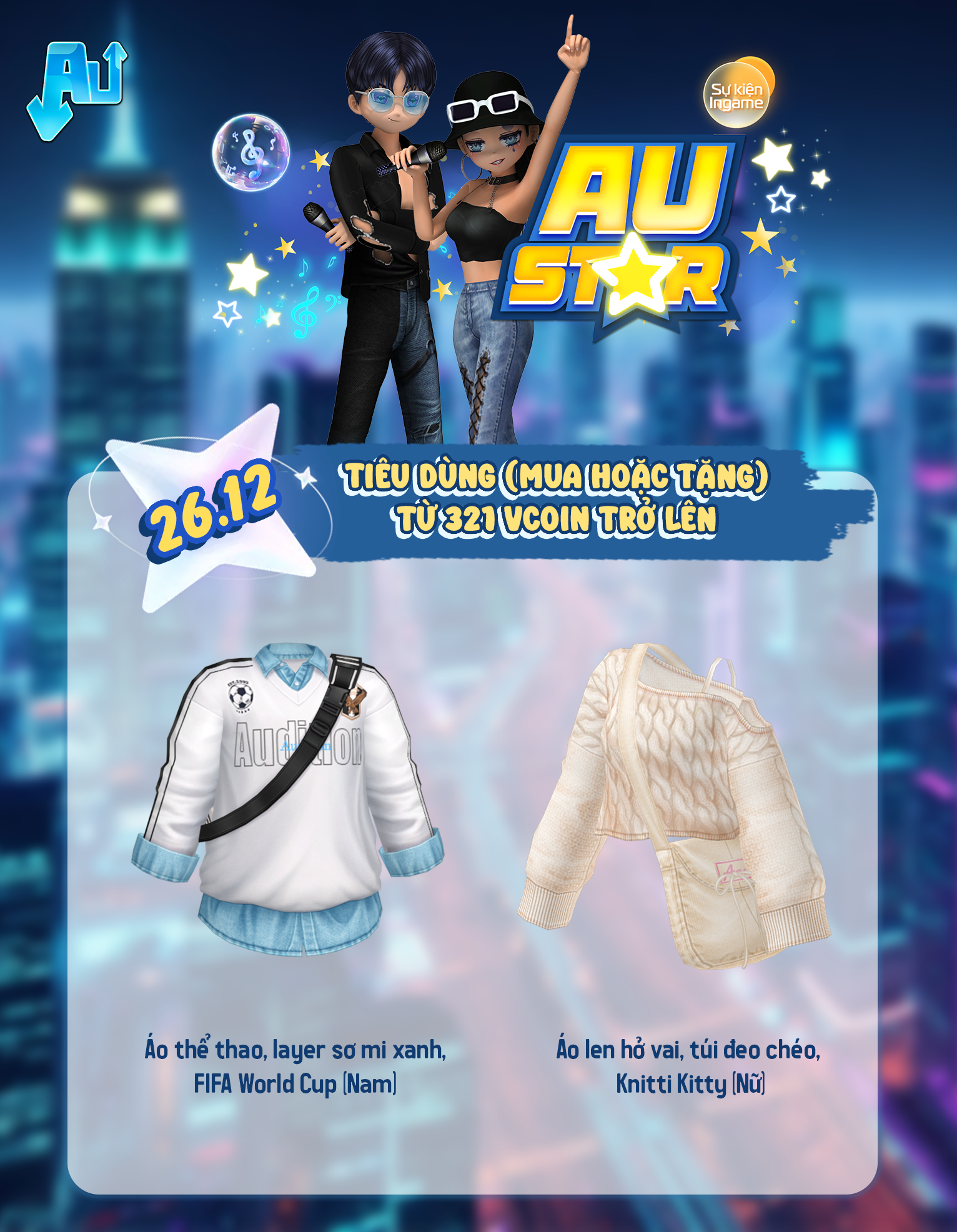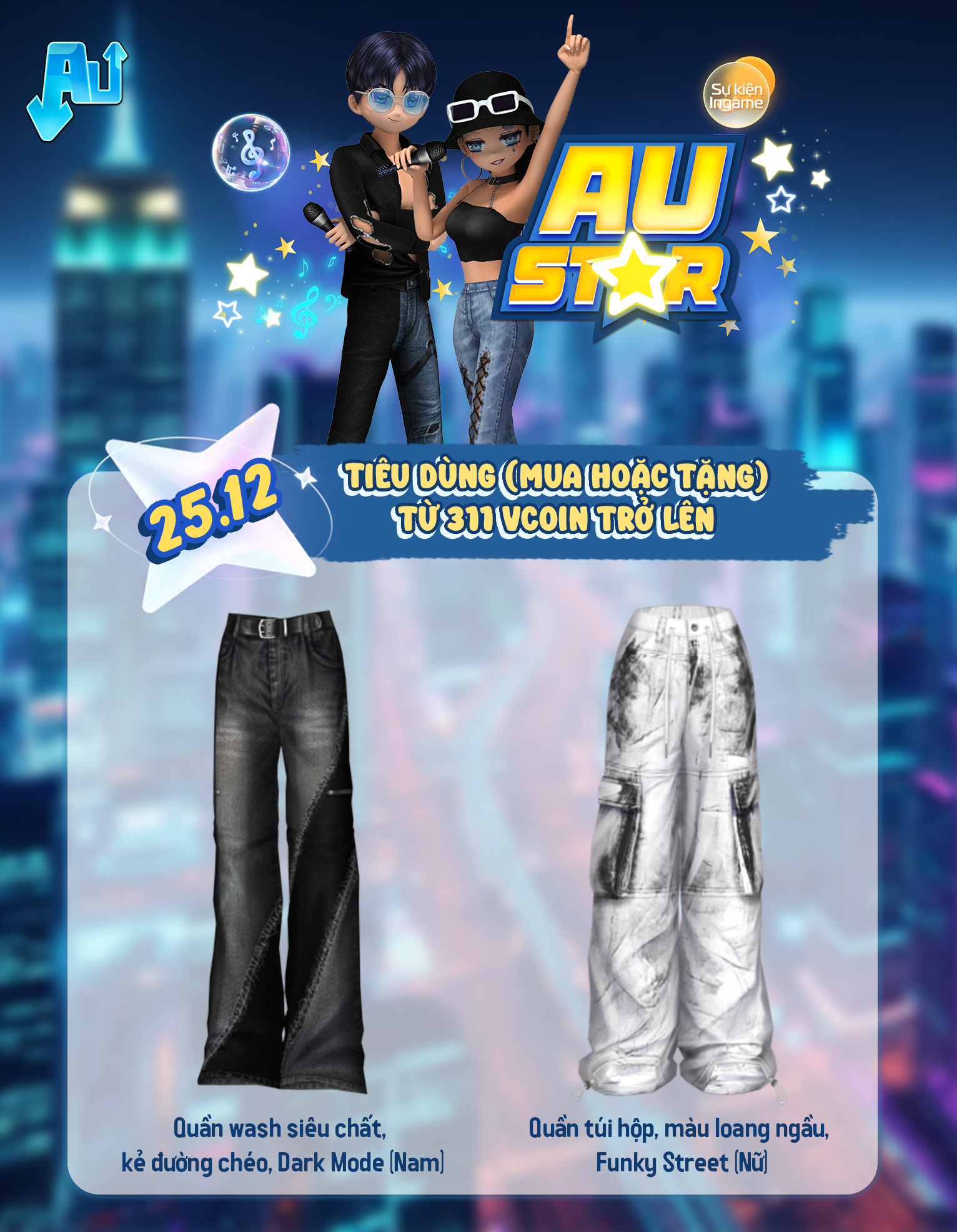 chính thức gọi tên những dancer sẵn sàng bứt phá giới hạn! 🌟Sự kiện lần này mang đến làn gió mới cho Thành Phố Vũ Hội với loạt item đậm chất ngôi sao, nơi phong cách và cá tính được đặt ngang hàng với kỹ năng. 🌟 Mỗi item đều được tạo ra để giúp dancer tỏa sáng theo cách riêng, bước lên sàn nhảy với thần thái của một AU STAR thực thụ. Khám phá ngay thôi!