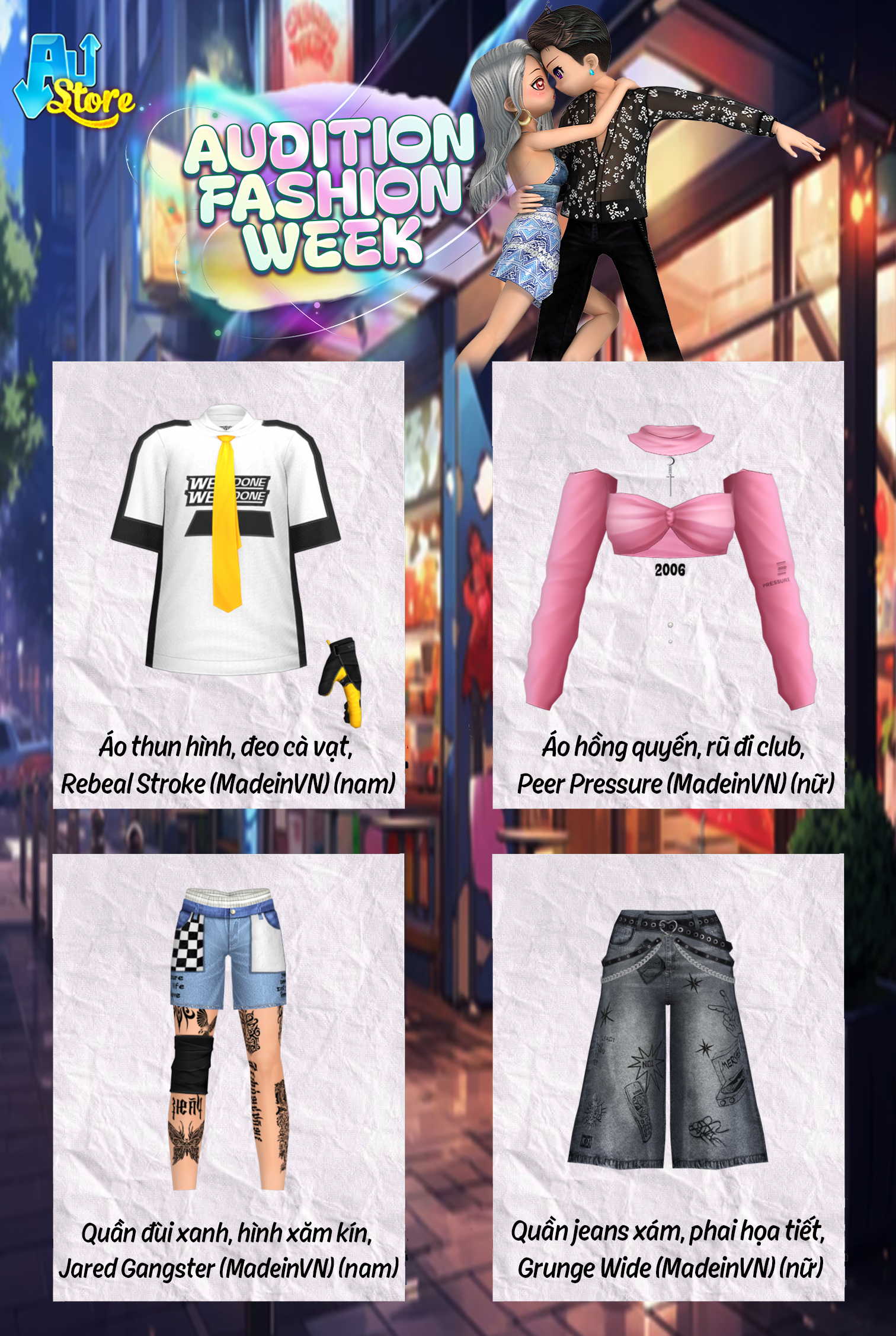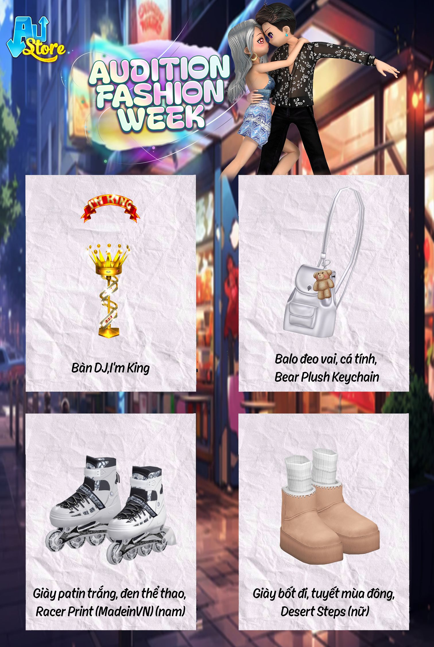 - Trong thời gian sự kiện, mỗi ngày trên Austore sẽ xuất hiện loạt item khác nhau