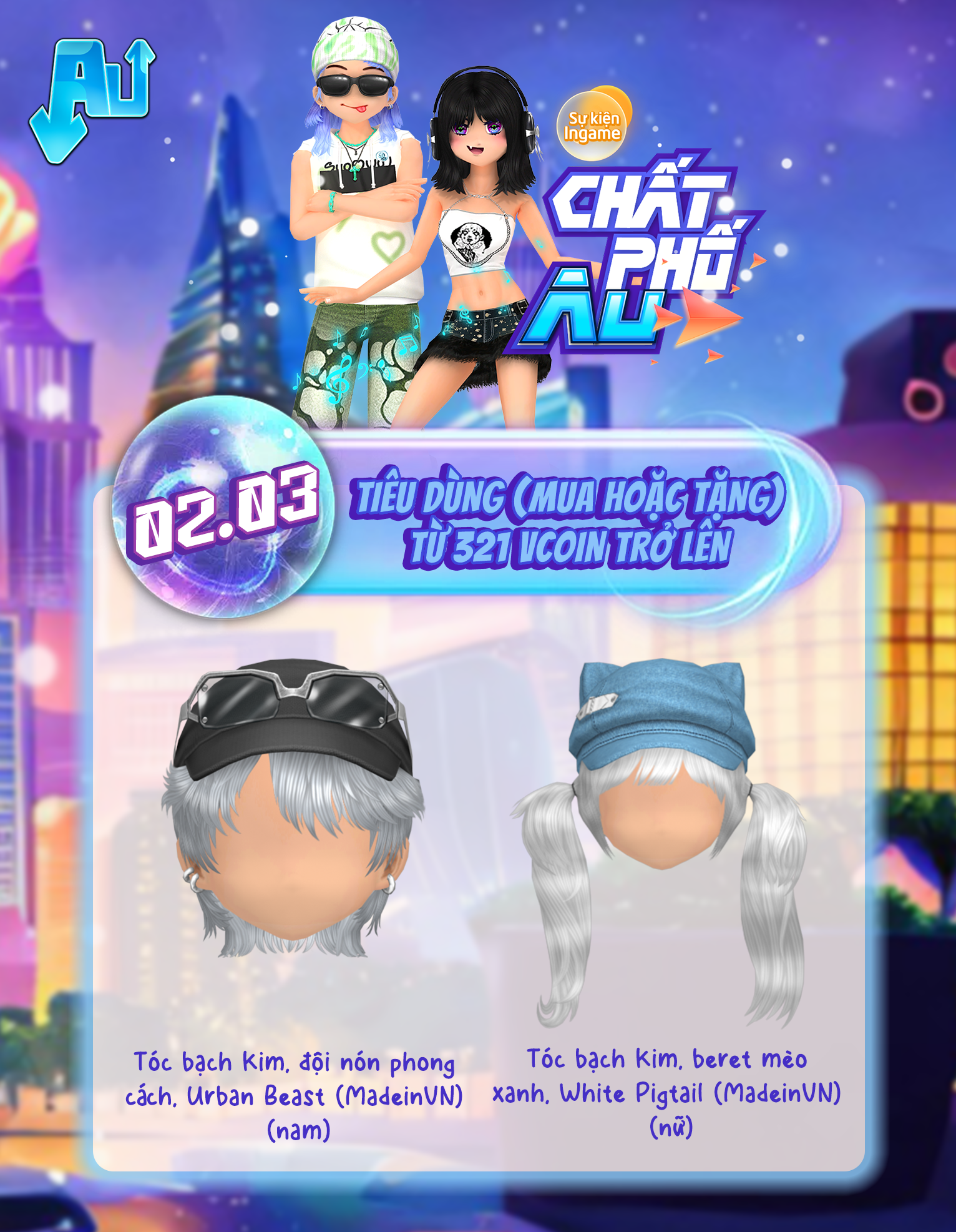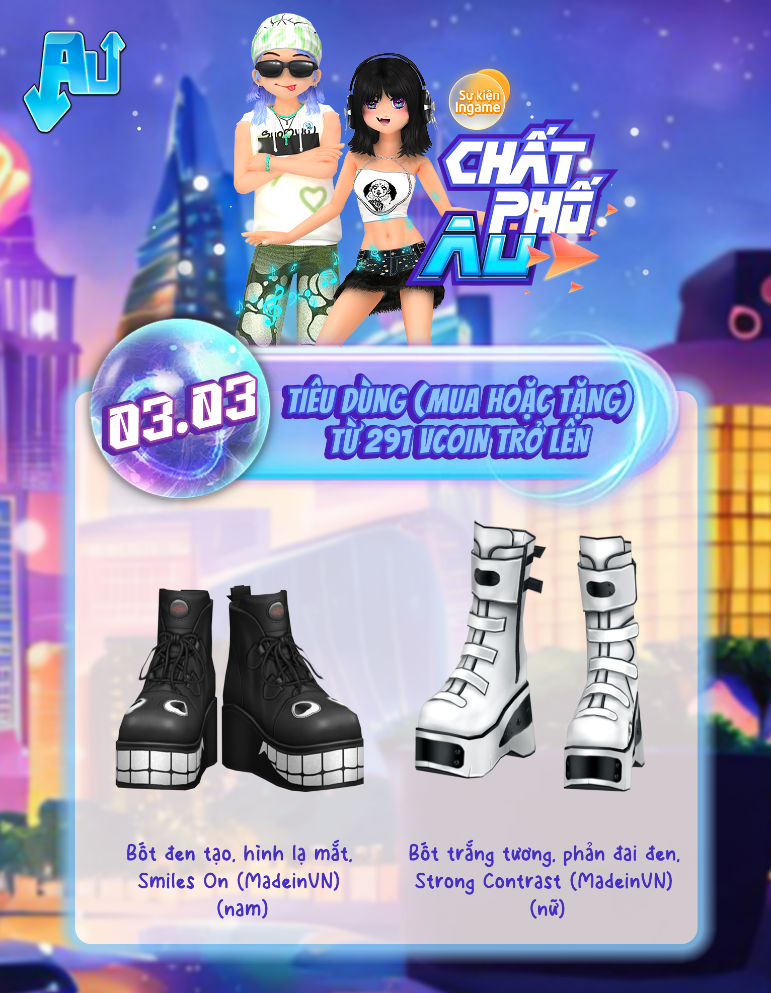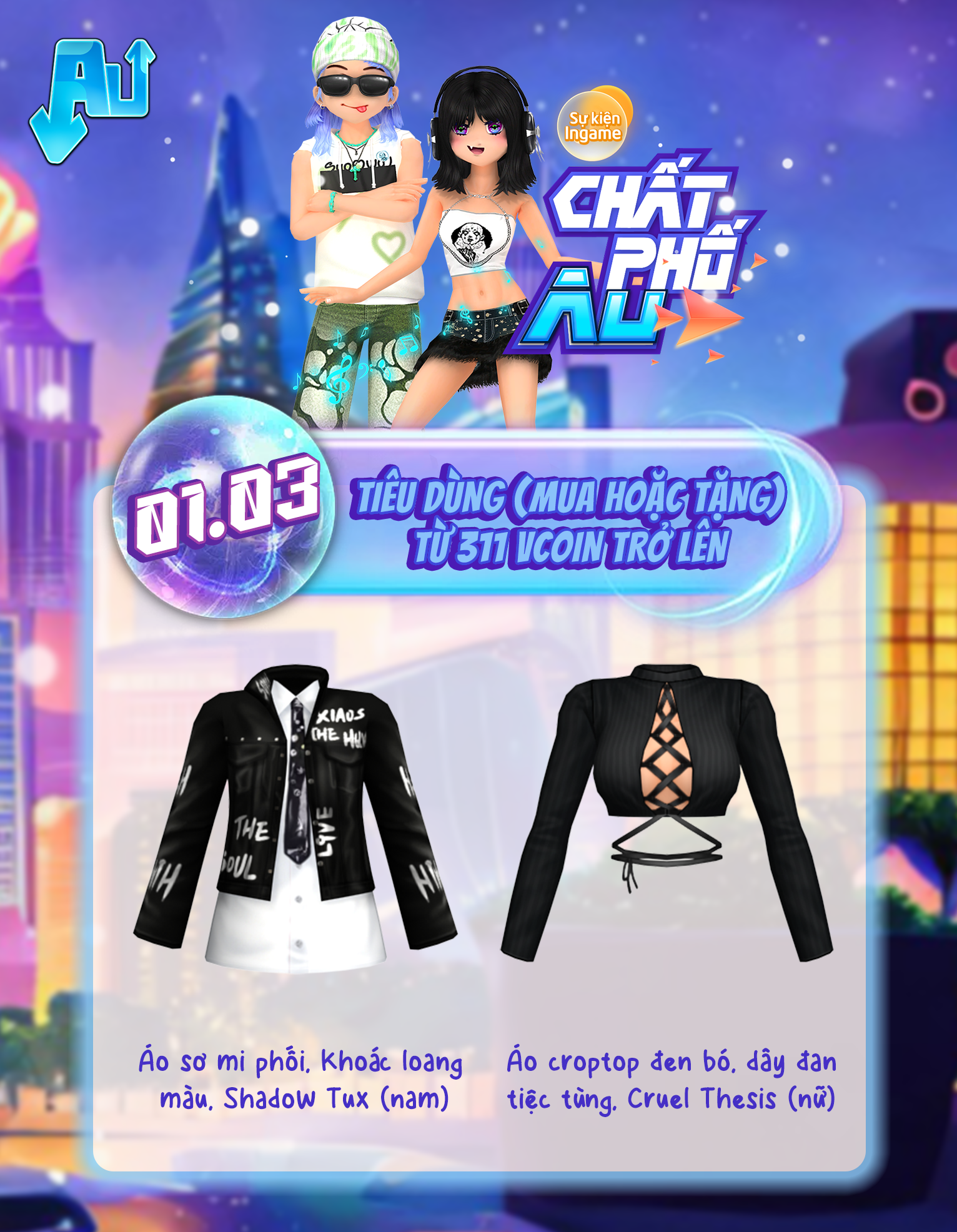 chính thức đổ bộ, mang hơi thở streetstyle cực chất lên mọi sàn nhảy! 🔥 Sự kiện lần này mang đến loạt item đậm phong cách đường phố với outfit năng động, sẵn sàng giúp các vũ công khẳng định gu thời trang riêng. Lên đồ thật chất, bước ra sàn và chứng minh phong cách của bạn chính là “chất phố” đích thực tại AU nhé! 😎✨