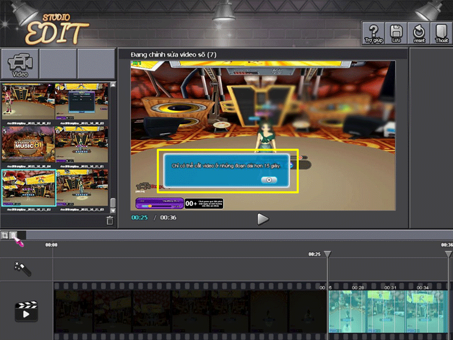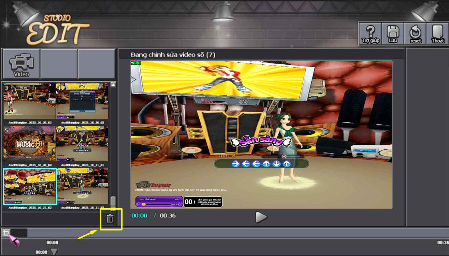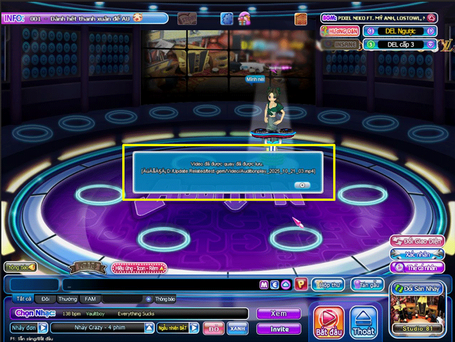 Lưu ý: trong trường hợp không xóa được trong game các bạn có thể vào đường dẫn ổ Audition\VIDEO để xóa thủ công.